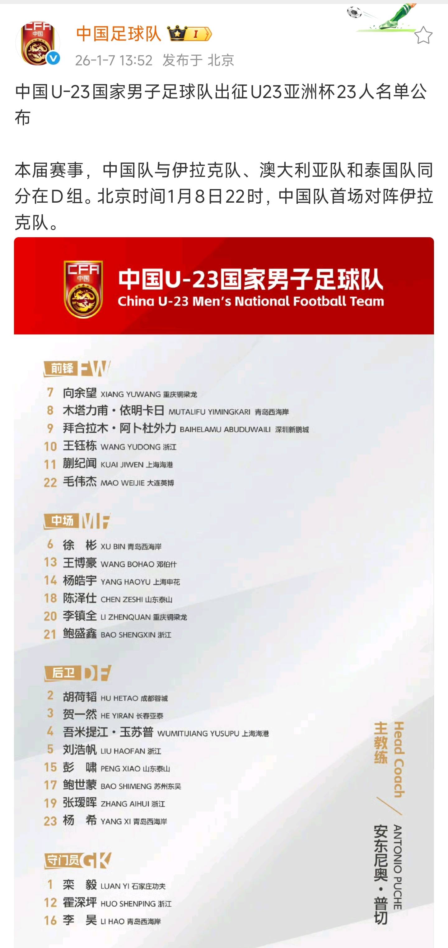 值得一提的是,在无缘2026美加墨世界杯后,对于中国足球而言,2026年和2027年的大赛机会相对较少。除了本次U23亚洲杯,由邵佳一带领的国家队将在2027年2月出战亚洲杯。因此,本次U23亚洲杯不仅是年轻球员们展示自己的舞台,也是中国足球重塑信心的重要机会。